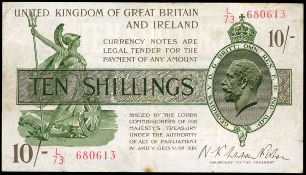 Treasury, N F Warren-Fisher (second issue), Ten Shillings, Nov. 1922, L/73 680613 in red, (Dugg. T30). Three main crease marks, small stain otherwise about Very Fine.