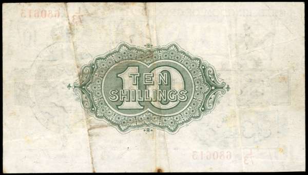 Treasury, N F Warren-Fisher (second issue), Ten Shillings, Nov. 1922, L/73 680613 in red, (Dugg. T30). Three m…