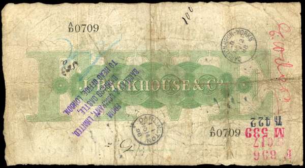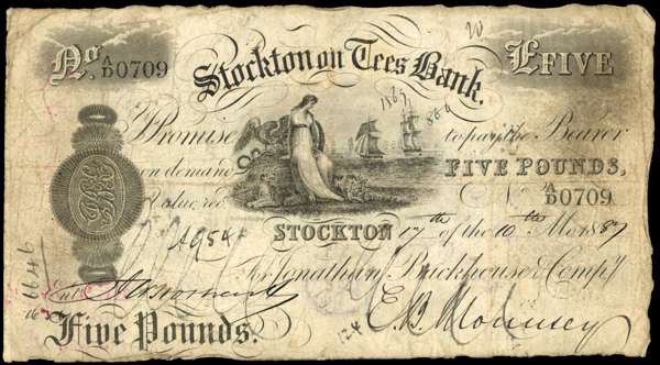 STOCKTON ON TEES, Stockton on Tess Bank, for Jonathan Backhouse & Co., £5.,17th. of the 10th. Month 1887, signed E B Mounsey, serial no A/D 0709, central vignette of commerce and ships, cancelled in black ink (Outing 2050b). Fine and complete.