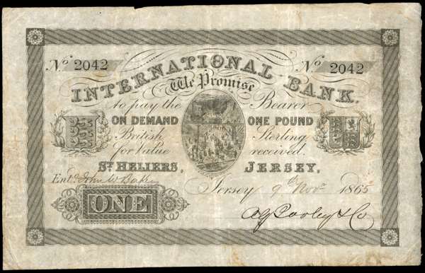 Jersey, St. Heliers International Bank, £1.,9 Nov 1865, serial no 2042, central vignette of a construction sit…