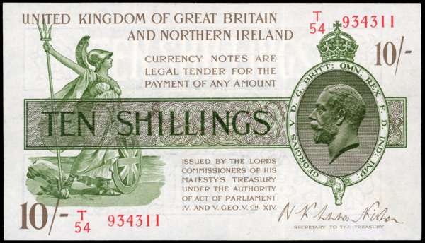 Treasury, N F Warren-Fisher (second issue), Ten Shillings, July 1927, T/54 934311 in red, (Dugg. T33). Good Extremely Fine.