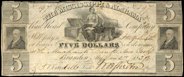 USA, MO. Brandon, Mississippi & Alabama Rail Road Company Uniface Five Dollars, 2 Jan 1837. Fine with ink sign…