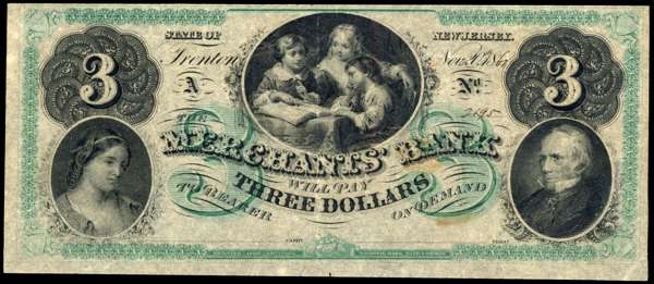 USA, NJ. Trenton, Merchants’ Bank, Unissued uniface Three Dollars, 20 Nov. 1861. Very Fine, one pin hole but sound, rare.