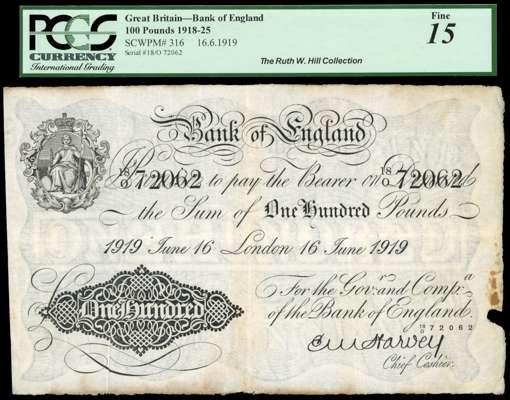 Bank of England, E M Harvey, White One Hundred Pounds, London, 16 June 1919, 18/0 72062 (Dugg. B209e). Fine, with crease marks and some staining, (encapsulated by PCGS as ‘Fine 15’).