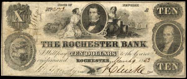 USA, NY. Rochester, The Rochester Bank, Uniface Ten Dollars, 9 Mar. 1853. Good Fine, complete.…