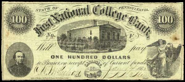 USA, PA. Carlisle, First National College Bank, Uniface One Hundred Dollars, 17 Jan 1866. Fine, complete.…