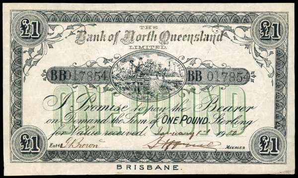 Australia Bank of North Queensland, One Pound, 1 Jan. 1900, No. BB 017854, Fantasy issue – probably issued for a stage production, (Pick unlisted). Good Very Fine.