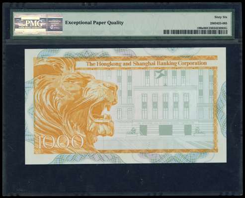 China, Hong Kong & Shanghai Banking Corporation, One Thousand Dollars, 31 Mar. 1983, K 398585, (Pick 190e). Uncirculated, Encapsulated by PMG and graded 66 Gem Unc.