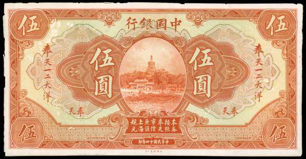 China, Bank of China, Uniface Obverse Proof of the 5-Yuan banknote, 1 July 1925, (Fengtien) Mukden, Manchuria, without serial number, unperforated and mounted on card stock, obverse: orange, view of a temple within oval border at centre, space for the signatures of the Governor and the Manager of the bank lower left and right, geometric design around all, American Bank Note Company Archive Proof, 178mm x 92mm (Pick 65B). Uncirculated, edges a little ragged due to mounting, some mount residue and “F7937” pencilled on the back, very rare.