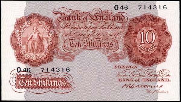 Bank of England, B G Catterns, Ten Shillings, Jul. 1930, O46 714316, (Dugg. B223). Good Extremely Fine.…
