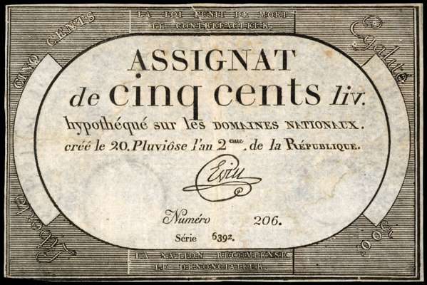 France, Revolutionary Republic, Unissued Assignat of Five Hundred Pounds, 20 Pluvoise, 2nd year of the Republic, (8 Feb 1793), series 6392, no. 206. Good Very Fine.