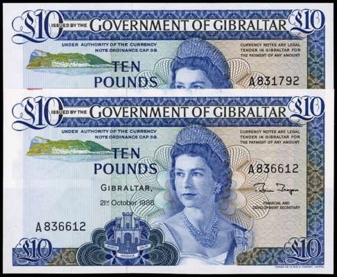 Gibraltar, Government, 21 August 1988, Ten Pounds, B Trayner, A831792, A836612, (Pick 22b)). Both Uncirculated. [2]
