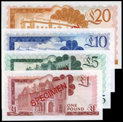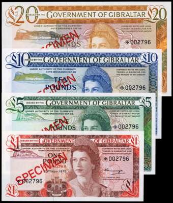 Gibraltar, Government, One Pound, 20 Nov 1975, Five Pounds, 1975, Ten Pounds, 1975, Twenty Pounds 1975, Fifty Pounds 1975, all four stamped SPECIMEN in red both sides and all four numbered +002796. (Pick 20s, 21s, 22s, 23s). All crisp uncirculated, rare. [4]