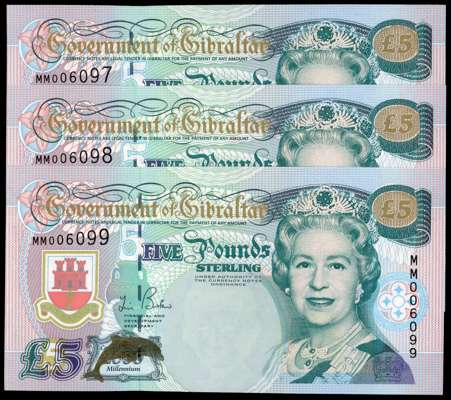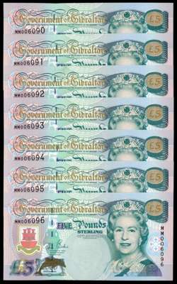 Gibraltar, Government, Five Pounds, 2000, Bristow, consecutive serial numbers MM 006090 to 006099, (Pick 29). All crisp Uncirculated. [9]