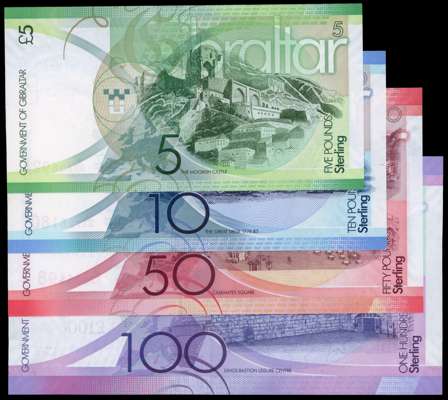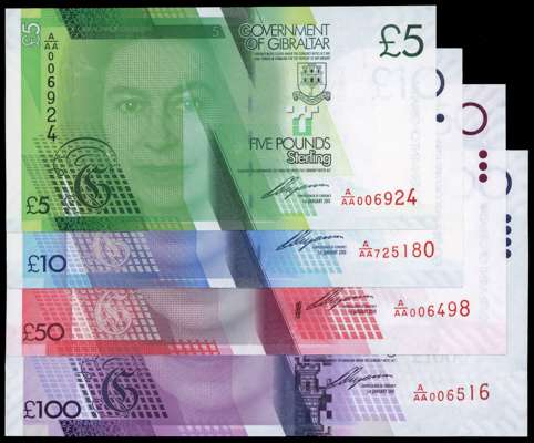 Gibraltar, Government, Five Pounds, 1 Jan 2011, A/AA 006924, Ten Pounds, 1 Jan 2010, A/AA 725180, Fifty Pounds, 1 Jan 2010, A/AA 006498, One hundred Pounds 1 Jan 2011, A/AA 006516, (Pick 35, 36, 38, 39). All crisp Uncirculated [4].