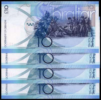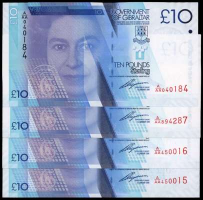 Gibraltar, Government, Ten Pounds, 1 Jan 2010, A/AA 0440184; 450015; 450016; 894287, (Pick 36). All crisp Unci…
