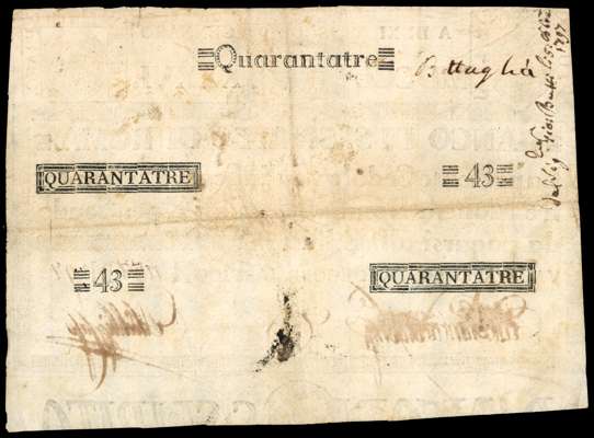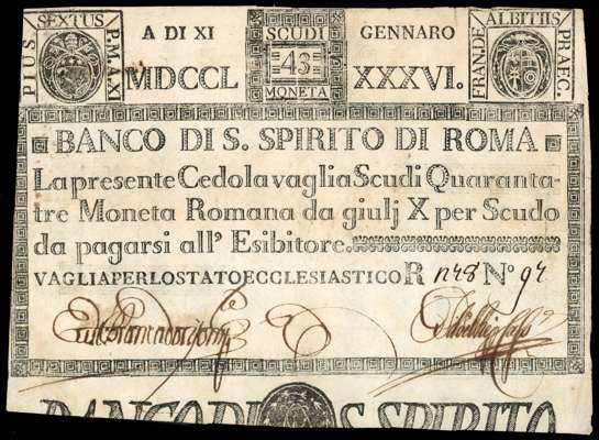 Italy, Papal States, Banco di S. Spirito di Roma, 1785-95 issue, 43 scudi, with black print, on parchment like…