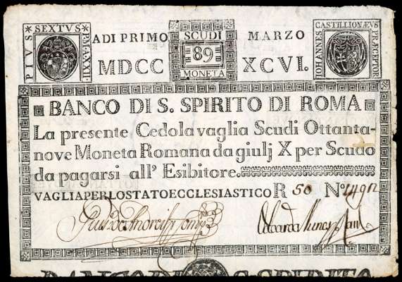 Italy, Papal States, Banco di S. Spirito di Roma, 1785-95 issue, 89 scudi, with black print, on parchment like…
