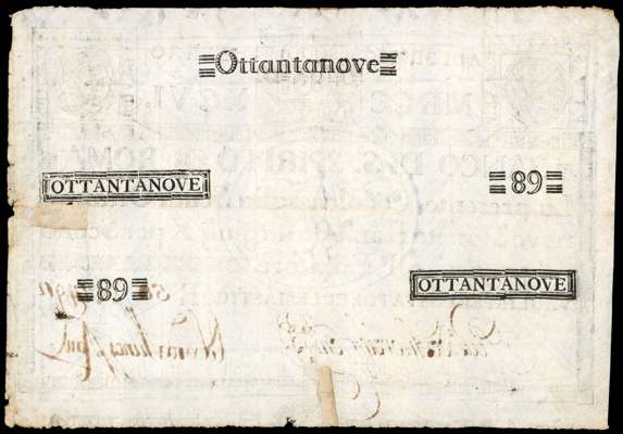 Italy, Papal States, Banco di S. Spirito di Roma, 1785-95 issue, 89 scudi, with black print, on parchment like paper, value in panel at centre. (Pick 463). Good Very Fine.