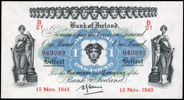 Ireland, Bank of Ireland, One Pound. Belfast, 15 Nov 1943, signed Adams, serial no. B 21043292. (BA 96; Pick 55b). Uncirculated.