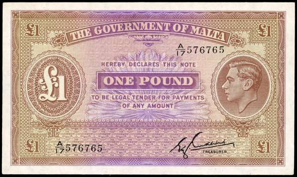 Malta, Government, George VI, One Pound, 1940-3, A/17 576765, E. Cuschieri (Pick 20c). About uncirculated.