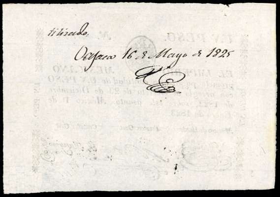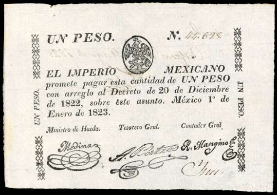Mexico, El Imperio Mexicano, One Peso, 1 January 1823, no. 44625, Mexican arms middle top, ink on rev. (Pick 1b). Extremely Fine.