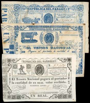 Paraguay, Tesoro Nacional One Real (1865) No 27500; One Peso (1865), No 198401; Two Pesos (1865), No 172667. (…