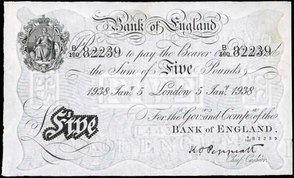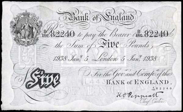 Bank of England, K O Peppiatt, White Five Pounds, London, 5 Jan. 1938, B/160 82239 and 82240 – consecutive num…