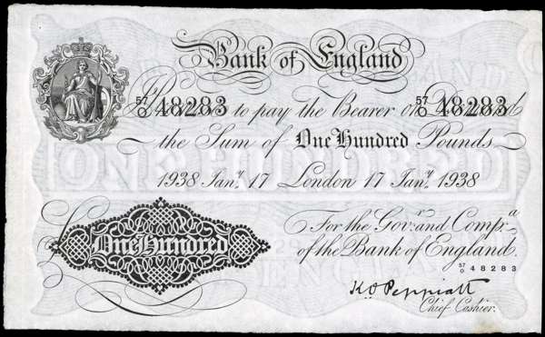 Bank of England, K O Peppiatt, White One Hundred Pounds, London, 17 Jan. 1938, 57/O 48283 (Dugg. B241). Two pi…