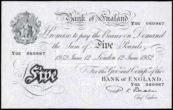 Bank of England, P S Beale, White Five Pounds, London, 12 Jun. 1952, Y05 060967, (Dugg. B270). Extremely Fine.…