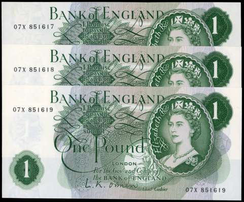 Bank of England, L K O’Brien, One Pound, Mar. 1960, O7X 851617, 851618 and 851619, (consecutive), (Dugg. B282)…