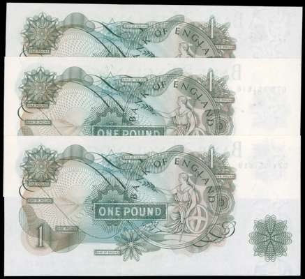 Bank of England, L K O’Brien, One Pound, Mar. 1960, O7X 851617, 851618 and 851619, (consecutive), (Dugg. B282), All good Extremely Fine/Uncirculated. [3 notes].
