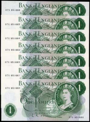 Bank of England, L K O’Brien, One Pound, Mar. 1960, O7X 851660, 851661, 851662, 851663, 851664, 851665 and 851666 (consecutive), (Dugg. B282), All good Extremely Fine/Uncirculated. [7 notes].
