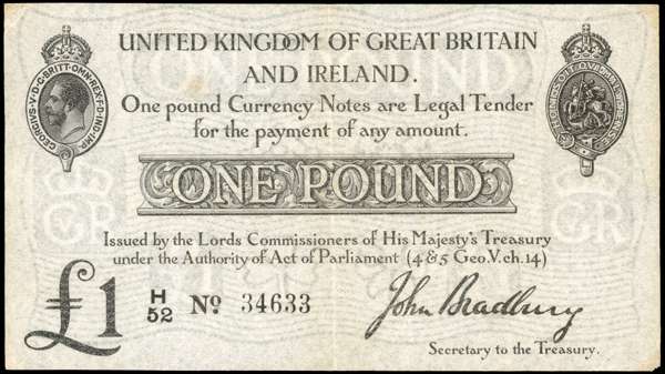 Treasury, J. Bradbury, (second issue), One Pound, Oct. 1914, H/52 34633. (Dugg. T11-1), Single central crease …