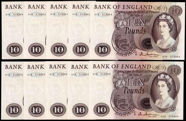 Bank of England, J Q Hollom, Ten Pounds, Feb. 1964, A16 518361 to 851370 (10 consecutive), (Dugg. B299), All a…