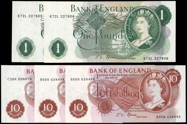 Bank of England, J S Fforde, One Pound, Feb. 1967, R72L 227805 and 227806, (consecutive), (Dugg. B307); Ten Sh…