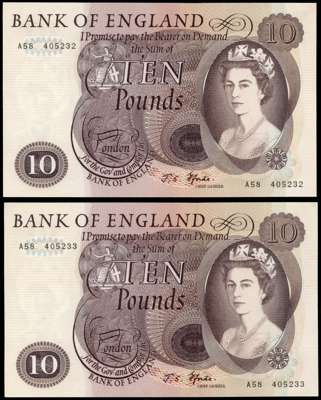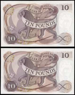 Bank of England, J S Fforde, Ten Pounds, Jan. 1967, A58 405233 and 405234 (consecutive), (Dugg. B316), Both go…