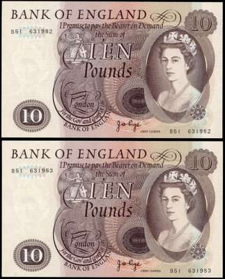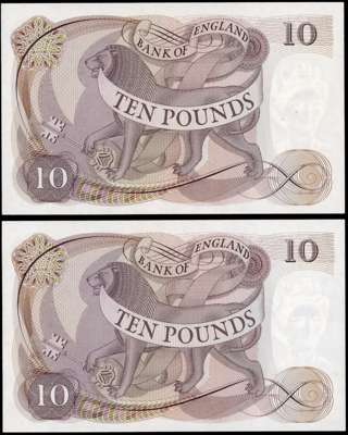 Bank of England, J B Page, Ten Pounds, 1971, B51 631982 and 631983 (consecutive), (Dugg. B326), Both good Extremely Fine/Uncirculated. [2 notes].