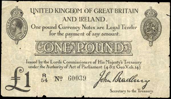 Treasury, J. Bradbury, (second issue), One Pound, Oct. 1914, R/54 60039, (Dugg. T11-1). Several crease marks v…