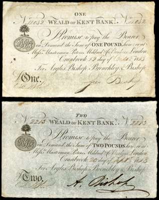 CRANBROOK, Weald of Kent Bank, for Argles, Bishop, Brenchleys & Bishop, £1and £2,12 October 1813 and 20 September 1813, serial numbers 11032 and 2213, A Bishop signature on £1,Geo Bishop signature on £2.,(Outing 608a, b). First Fine with small edge tear above ‘ONE’, second about Very Fine. [2 notes].