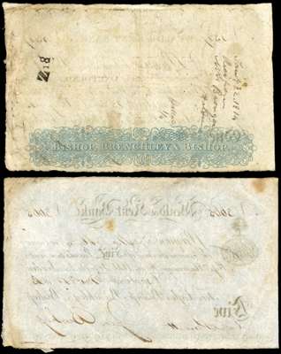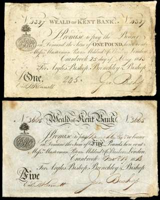 CRANBROOK, Weald of Kent Bank, for Argles, Bishop, Brenchleys & Bishop, £1.,and £5.,variation of the two in previous lot – in that there is no denomination at the middle top. Dated 25 May 1813 and 19 November 1813, serial number 4327 and 3665, both Geo Bishop signature (Outing 608a var., c var.). First Fine, ink notations on rev., second Very Fine. [2 notes].
