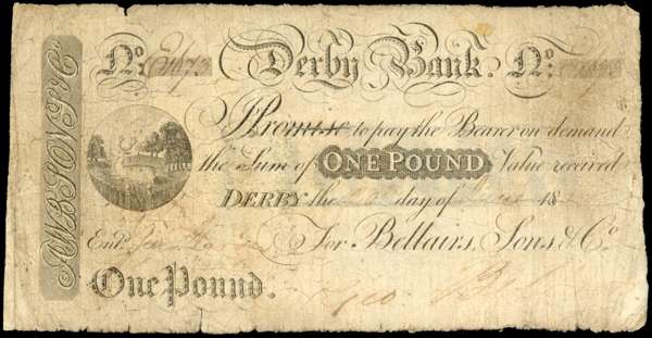 DERBY, Derby Bank, for Bellairs, Sons & Co., £1.,20 June1814, serial number E1673, Bellairs signature, vignett…