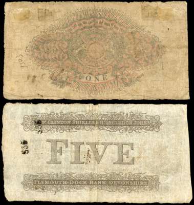 DEVONPORT, Plymouth Dock Bank, Devonshire, for Thomas Clinton Shiells & Henry Incledon Johns, £1.,and £5.,1 September 1823 and 26 March 1819, serial number 2841 and 1833, both signed T C Shiels, both with vignette l. of sailing ship, first with Congreve design on rev., second with denom. (Outing 683c,e). First about Fine, second good Fine, both with inked numbers on rev. [2].