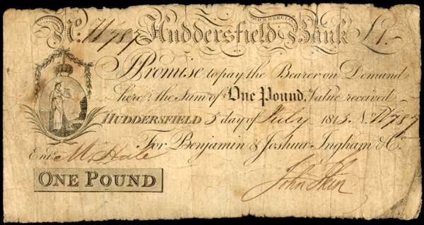 HUDDERSFIELD, Huddersfield Bank, for Benjamin & Joshua Ingham & Co, £1.,5 July 1815, serial number W787, John Ikin signature, vignette of Commerce standing to l., (Outing 1004b). Fine staple hole and small tear above ‘BANK’, clean.