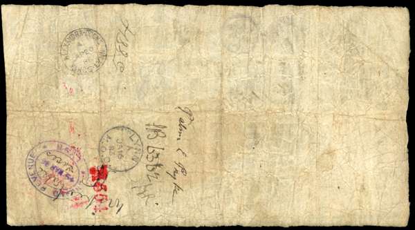KINGS LYNN, Lynn Regis & Norfolk Bank, for Louis Weston Jarvis & Lewis Whincop Jarvis £5.,28 August 1882 serial number B8671, signed L W Jarvis, numerous bankruptcy stamps and ink refs. on rev. (Outing 1075d). Good Fine.