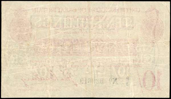 Treasury, J. Bradbury, (second issue), Ten Shillings, Jan. 1915, P/3 029619. (Dugg. T13-1), Several crease mar…