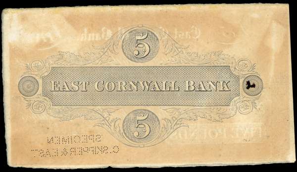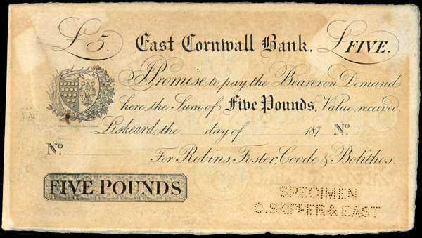 LISKEARD, East Cornwall Bank, for Robins, Foster, Goode & Bolithos, Specimen £5.,187-, paper perforated ‘SPECIMEN C SKIPPER & EAST’ at bottom right (Outing 1195c). Overall brown foxing, otherwise Extremely Fine.