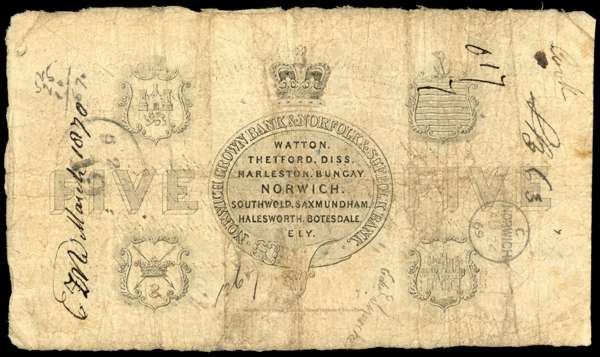 ORWICH, Norwich Crown Bank & Norfolk & Suffolk Bank for Harveys and Hudsons, £5.,1 July 1868, serial number 99465, signed by R D Kerrison (Outing 1606k). Good Fine, ink notations on rev.