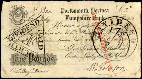 PORTSMOUTH, Portsmouth, Portsea & Hampshire Bank, for Godwin, Minchin, Carter, Lindegreen & Goldson, £5.,30 July 1812, serial number G3255, Wm. Goldson signature, three dividend hand-stamps. (Outing 1742c). About Fine, overall presentable.