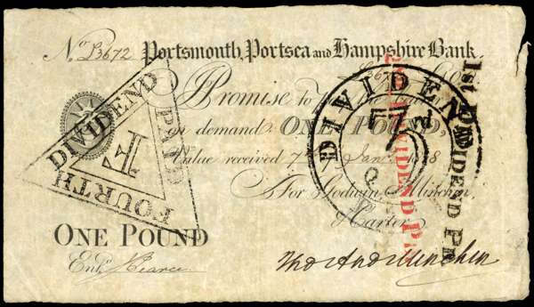 PORTSMOUTH, Portsmouth, Portsea & Hampshire Bank, for Godwin, Minchin & Carter, £1.,7 January 1818, serial number L3672, Thos. Minchin signature, four dividend hand-stamps. (Outing 1742e). About Fine, overall a presentable.